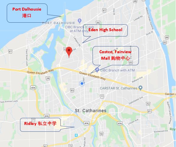 物业位置: 物业位于圣凯瑟琳市北部,小区环境静谧温馨,距离港口3分钟,Fairview商场3.1公里,驱车5分钟便可到达,周边有sobeys 超市,Costco大卖场,Scotiabank, CIBC银行等等,日常生活十分便利。